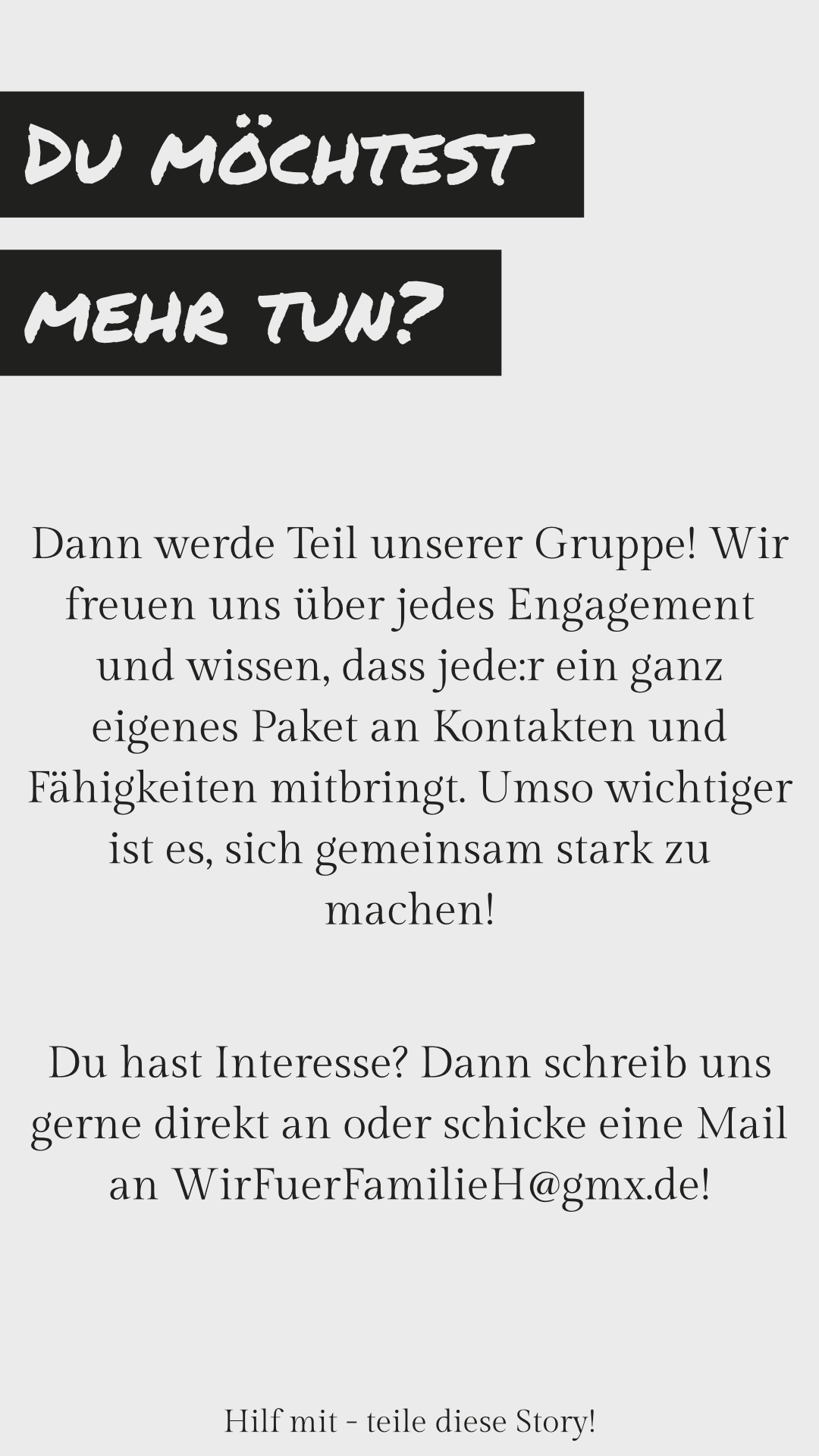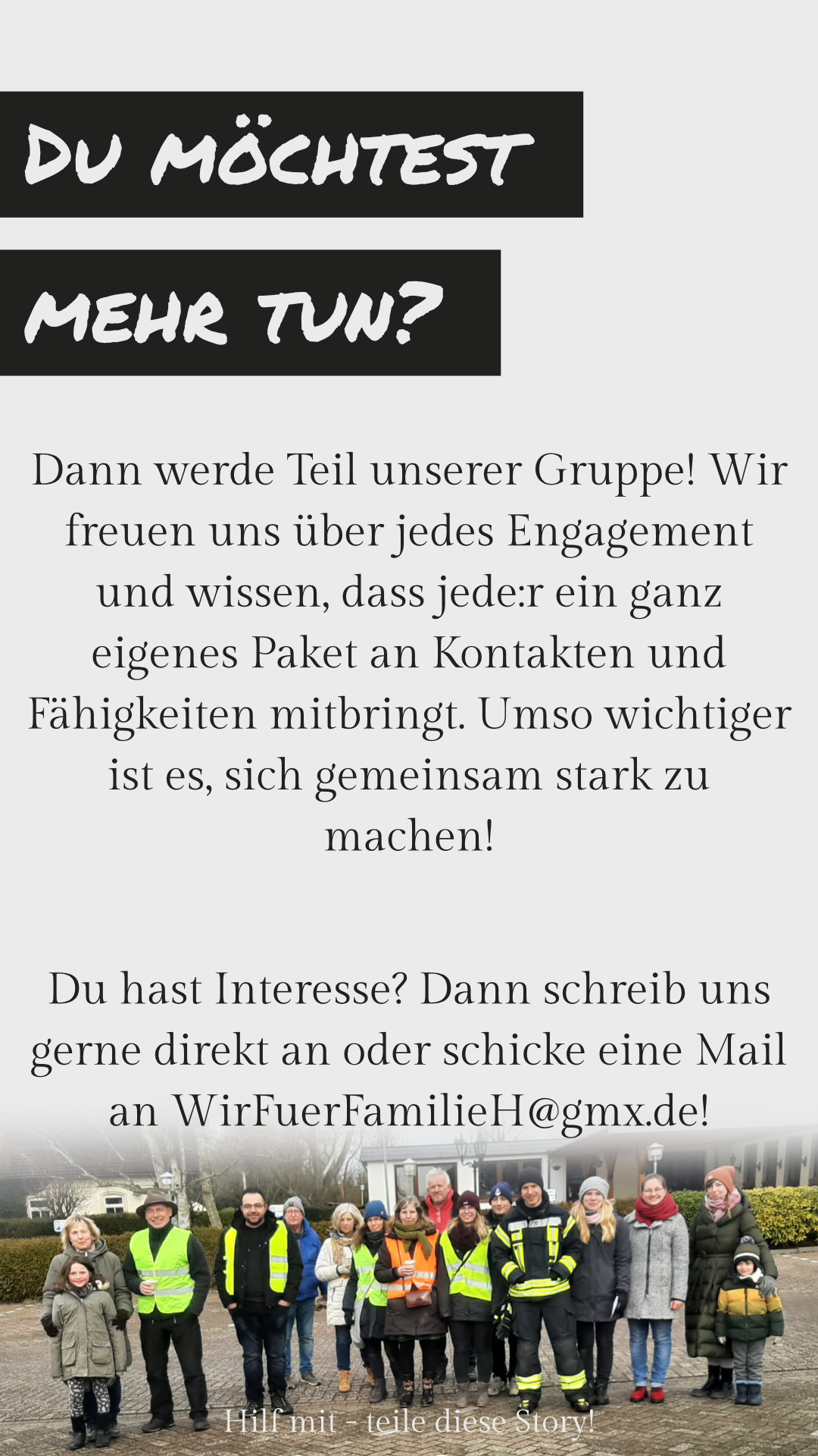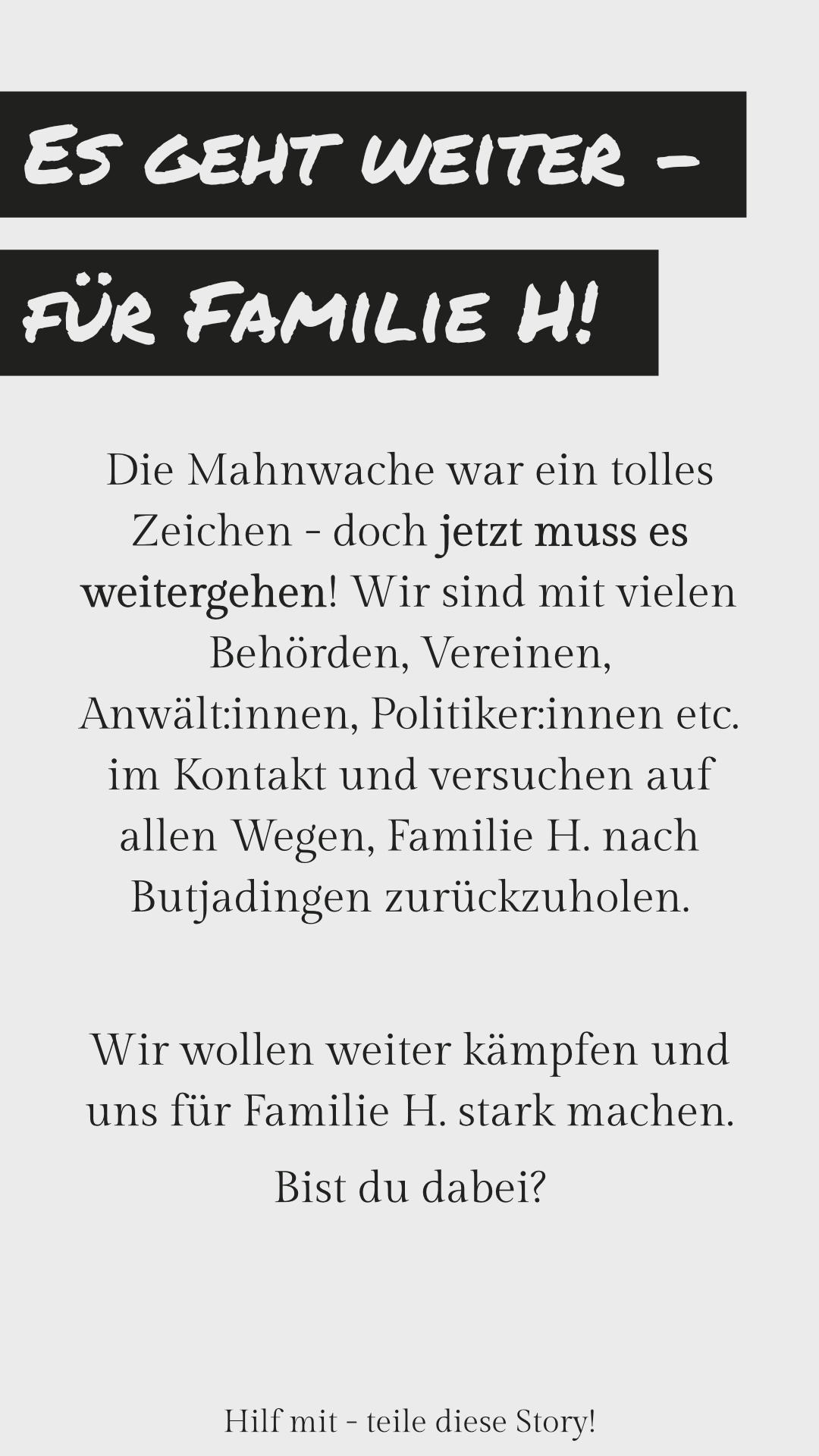Du wohnst in Butjadingen oder bist in der Nähe? Dann schaue gerne auf der News-Seite, welche aktuellen Aktionen wir planen und sei mit dabei! Es ist so wichtig, Präsenz zu zeigen, um fortlaufend auf den Fall der Familie H. aufmerksam zu machen.